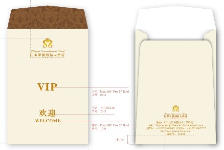 酒店所用制的貴賓卡封套,主要用途是將酒店VIP卡進行貼切的包裝,可保護貴賓卡的表層,封套的風格設計與酒店形成統一風格,將一份精心包裝后的貴賓卡送至客人手中,讓顧客感受到酒店的用心與貼切。同時,也傳達了酒店僅在一個貴賓卡封面的設計也是花費了很大用心與精力去制作的,讓每一位客人感到酒店溫馨貼切的服務,酒店也會在眾人眼前表現出最好最優質的服務形象!